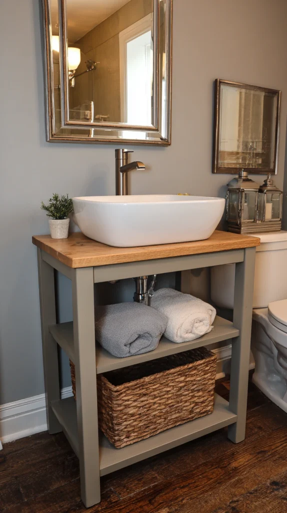 Open shelving beneath a vanity countertop offers a relaxed, boutique-hotel aesthetic that feels both casual and considered. Rather than hiding everything behind cabinet doors, open shelves invite you to display neatly folded towels, woven baskets, ceramic canisters, and curated toiletries.