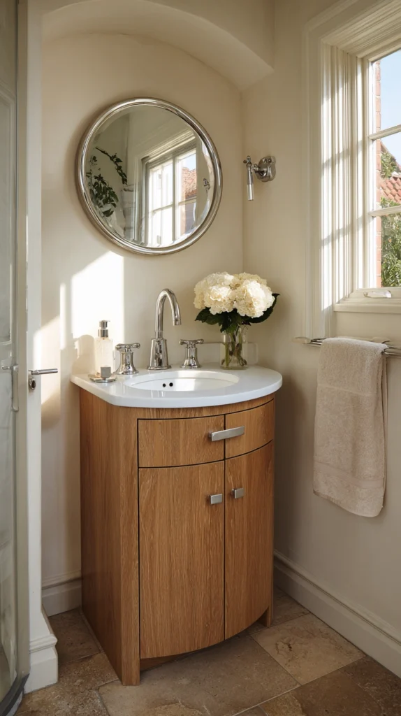 A vanity with a softly rounded front edge, a semi-circular silhouette, or a curved apron transforms the bathroom into something that feels almost sculptural. Curved vanities are especially impactful in small bathrooms because they soften the boxiness of the room and create a sense of flow.