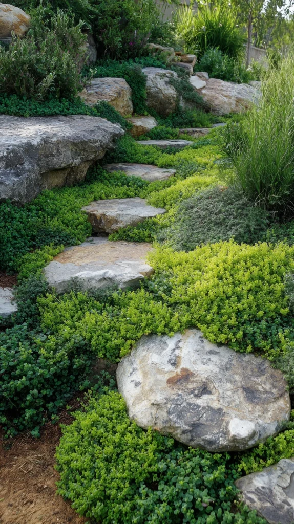 Placing stepping stones through a dense, low-growing ground cover such as creeping Jenny, thyme, ajuga, or chamomile creates a charming and cohesive look. The ground cover unifies the planting area while the stones provide definition and structure.