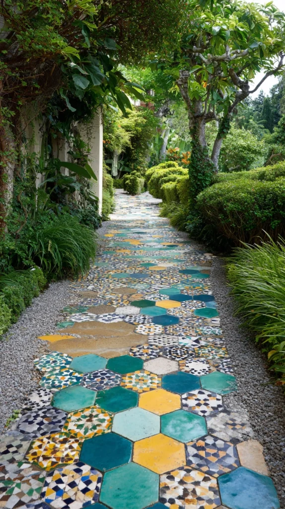 For bold, contemporary gardens with a design-forward sensibility, a pathway made from geometric patterned tiles can become one of the most striking features of the entire space.