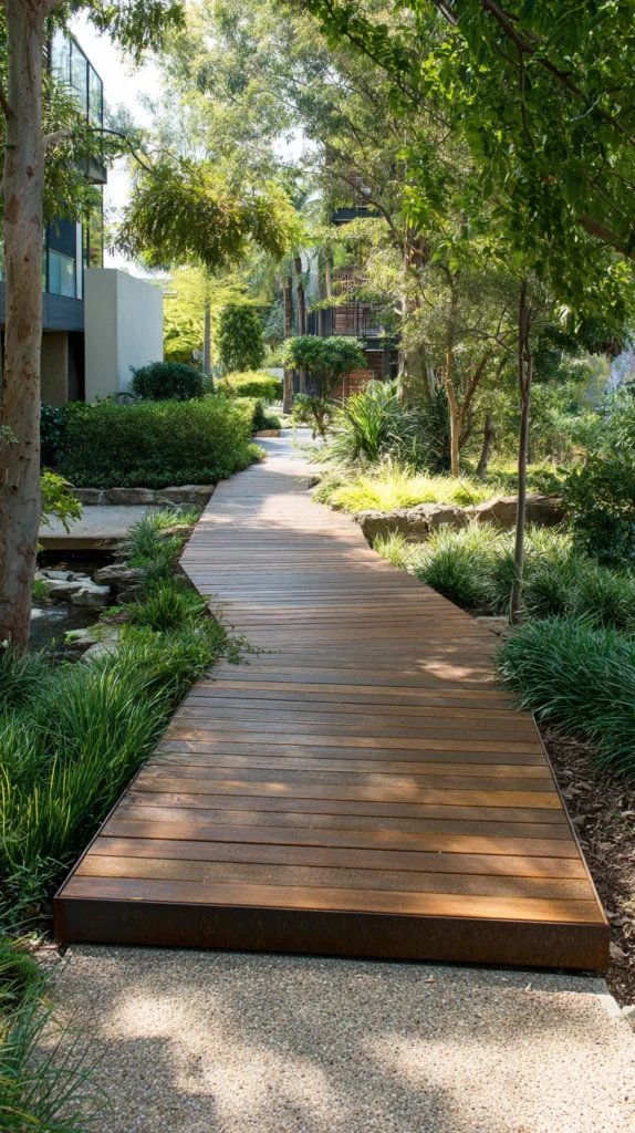 Combining raw timber decking with sleek steel edging creates a pathway that feels industrial yet warm — a combination that works exceptionally well in urban gardens and rooftop terraces. The contrast between the natural grain of the wood and the precision of the metal detailing gives this style an architectural quality that photographs beautifully. Add solar-powered path lights along the steel edging to extend the visual impact into the evening hours.
