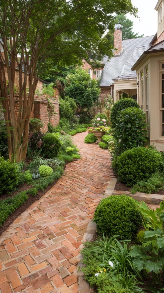 Reclaimed or aged bricks add warmth and a sense of history, while newer bricks in terracotta or warm red tones bring a clean, polished finish. This style suits cottage gardens, formal gardens, and traditional home exteriors beautifully.