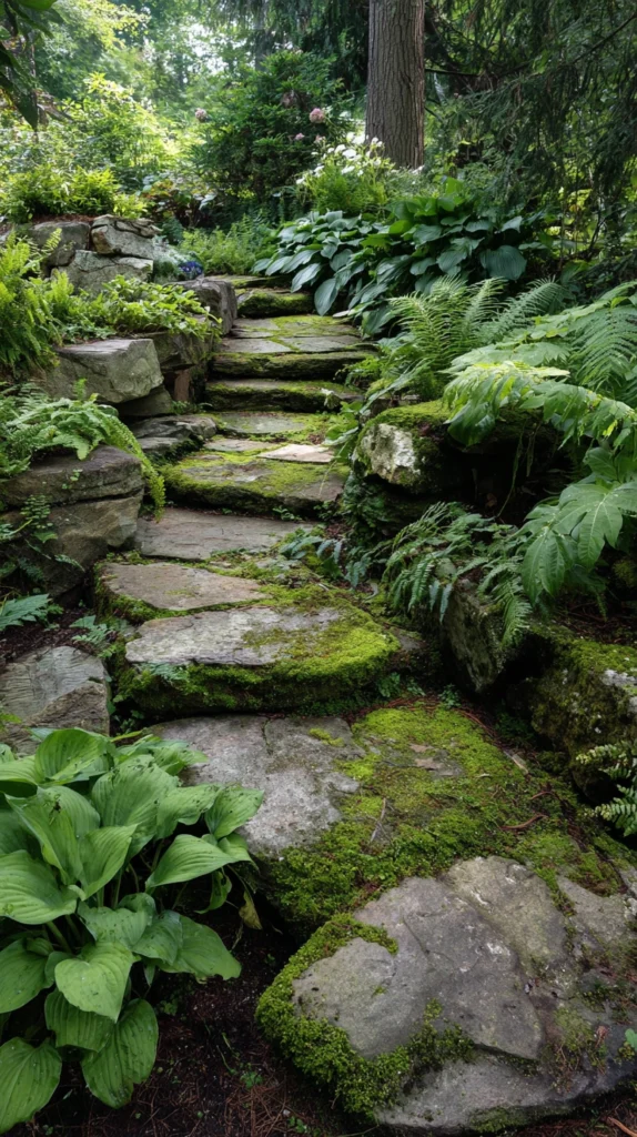 In a shaded or woodland-style garden, nothing creates atmosphere quite like a mossy stone path winding through layers of ferns, hostas, and hydrangeas. Allow moss to grow naturally between and over the stones for an ancient, enchanted quality.