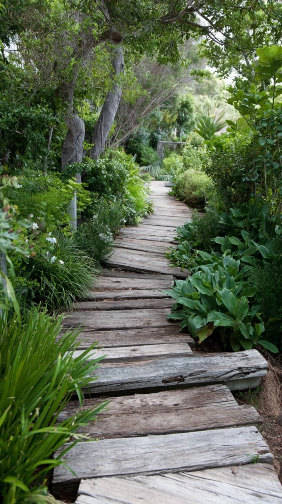 A boardwalk-style pathway made from reclaimed timber brings warmth, texture, and a coastal or countryside feel to any garden. Raised slightly above the ground, this style works particularly well in wet or boggy areas where a standard path might become muddy or unstable.