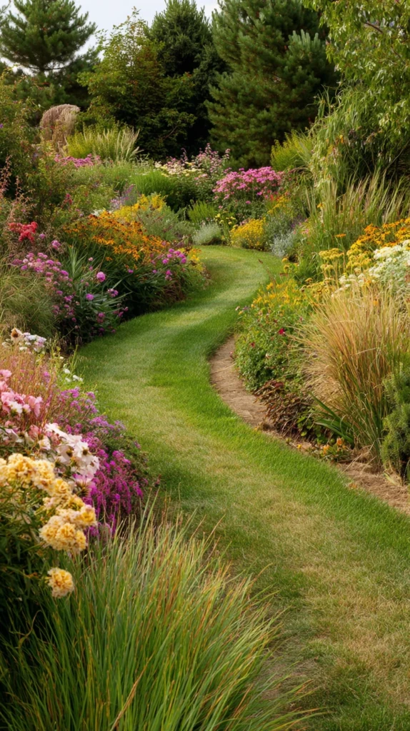 Sometimes the most striking pathway is simply a mown or shaped strip of grass cutting through dense, lush planting beds. A gently curving grass path flanked by tall perennials, ornamental grasses, and flowering shrubs creates a sense of discovery and depth, encouraging visitors to slow down and explore.