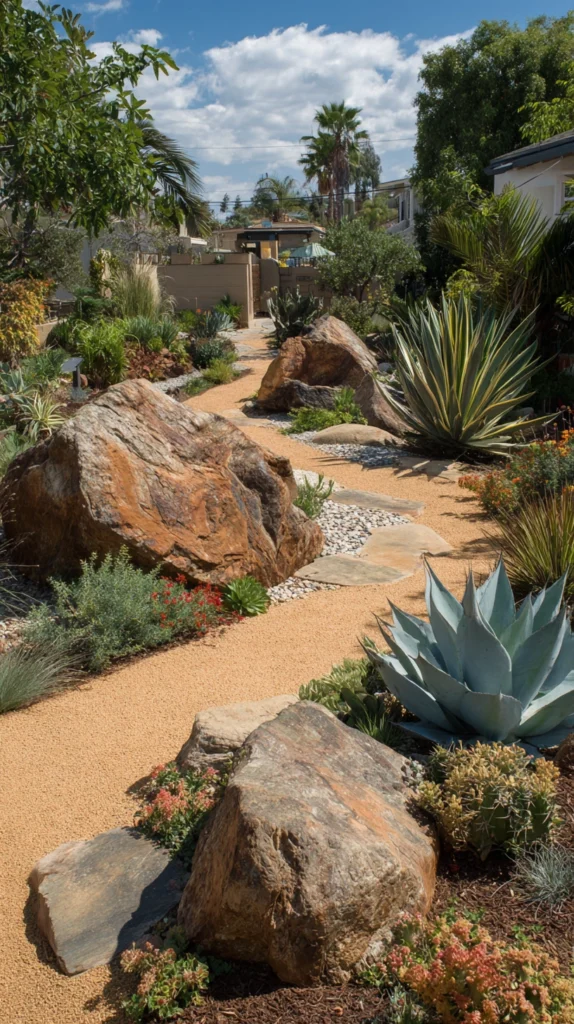 Decomposed granite is a popular pathway material in dry and Mediterranean-style gardens. Its warm, sandy appearance complements drought-tolerant plants beautifully, and when paired with large statement boulders and architectural succulents like agave or yucca, it creates a landscape that feels both wild and considered.