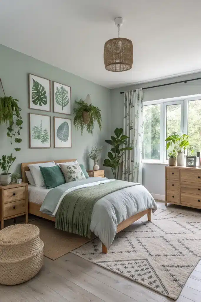 - Natural wood furniture and plant-inspired décor