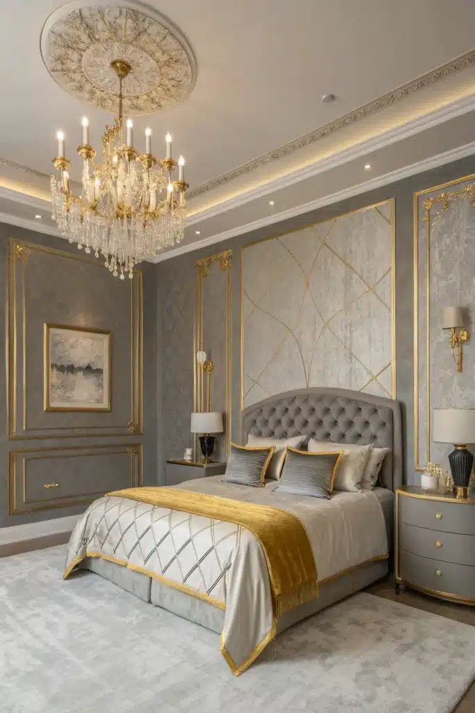 Add luxury and glamour with metallic gold accents against sophisticated grey backgrounds for an opulent bedroom design.