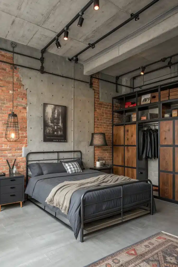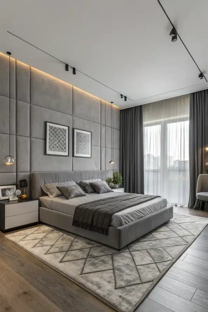 Combine cool greys with raw materials like exposed brick, metal, and concrete for an urban, edgy bedroom design.