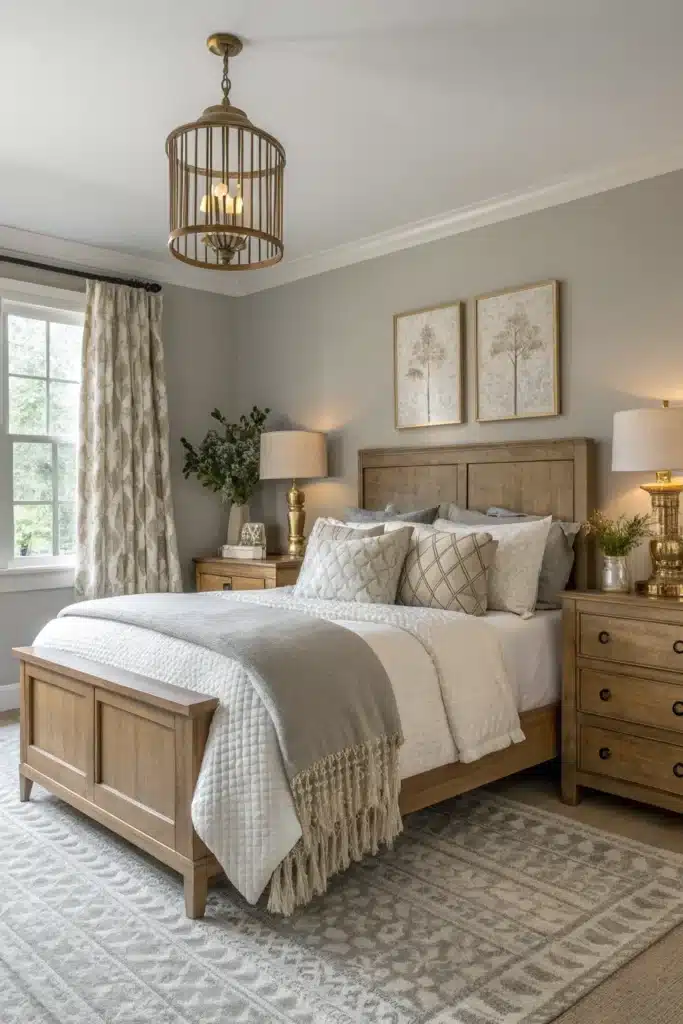 Use warm undertone greys with beige, taupe, and cream accents to create a cozy, inviting bedroom atmosphere.