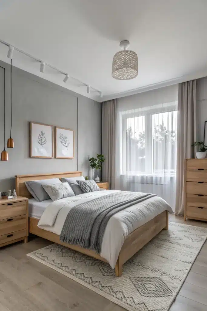 Embrace Nordic design principles with light greys, natural materials, and clean lines for a serene, uncluttered bedroom.