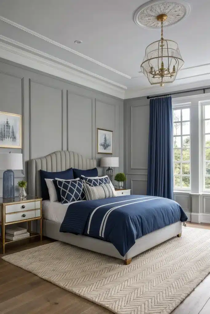 Pair sophisticated grey tones with deep navy blue accents for a classic, timeless bedroom with nautical influences.