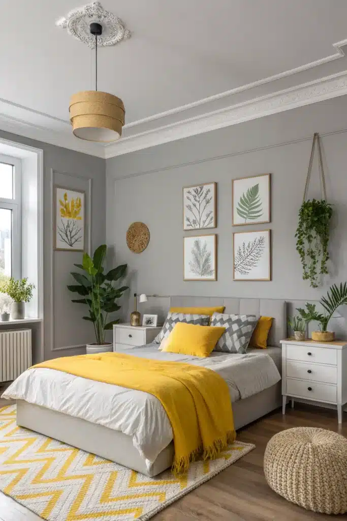 Brighten grey bedrooms with sunny yellow accents that add energy and warmth while maintaining sophistication.