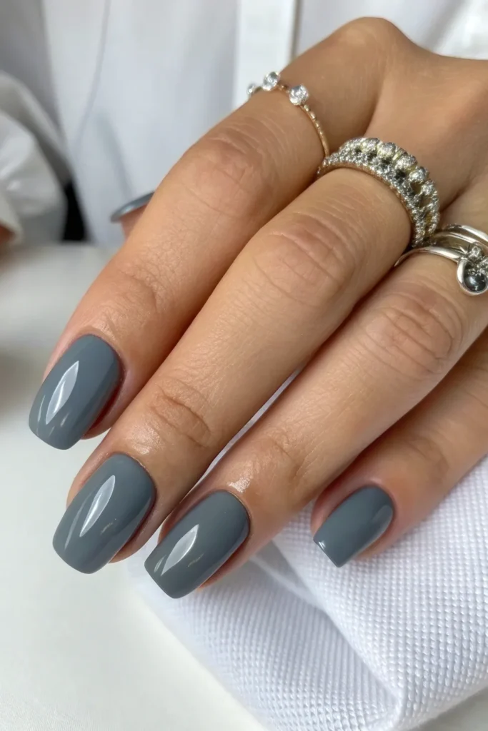 A timeless option that never fails is a simple glossy gray manicure. The shine adds depth to the color and makes your nails look neat and polished. On short nails, this style feels clean and sophisticated without trying too hard. It’s perfect for everyday wear, whether you’re at work or running errands.