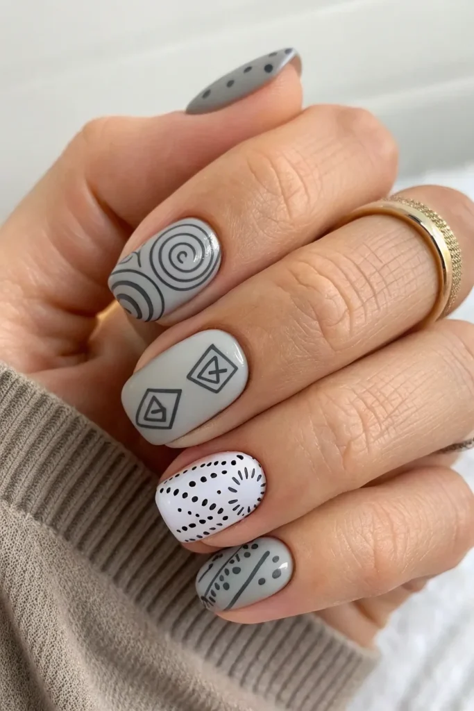 Abstract designs are fun and unique, and they work surprisingly well on short nails. Think gray swirls, dots, or geometric shapes against a nude or light background. It’s artsy and modern, giving your nails a creative twist.