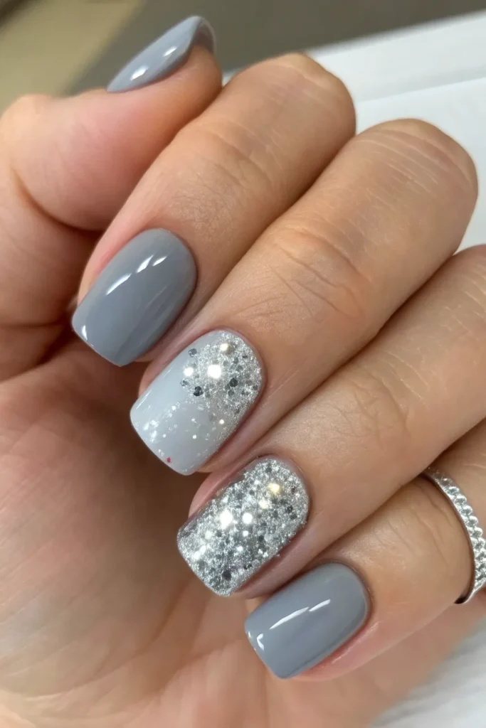 If you want a touch of glam without overpowering short nails, add silver glitter to one or two accent nails. The subtle sparkle contrasts beautifully against a gray base, making the manicure elegant yet playful.