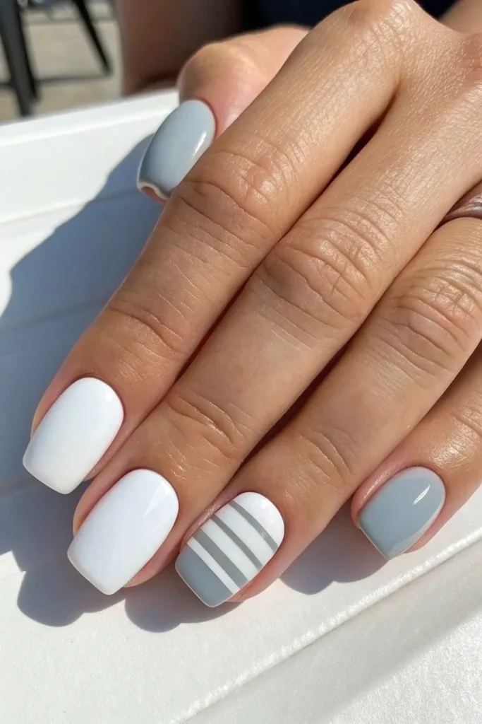 Light gray paired with crisp white creates a soft, airy design that makes short nails look fresh and bright. You can alternate between gray and white nails, or even add simple stripes for a modern twist.