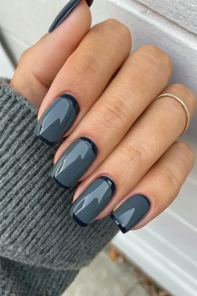 Give your short nails a stylish edge by painting them a deep charcoal gray and finishing with glossy tips. It’s like a reversed French manicure—sleek, modern, and chic.