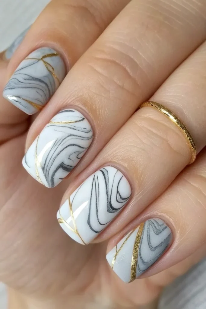 Marble nails never go out of style, and short nails look surprisingly elegant with this design. Swirls of white and gray mimic natural stone textures, giving your nails a high-end finish.