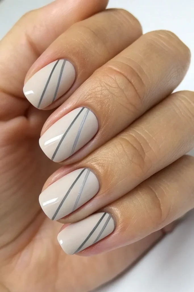 For a modern, graphic look, go for a nude base with thin gray lines or stripes. This minimalist design works wonderfully on short nails, making them look sharp and stylish without too much effort.