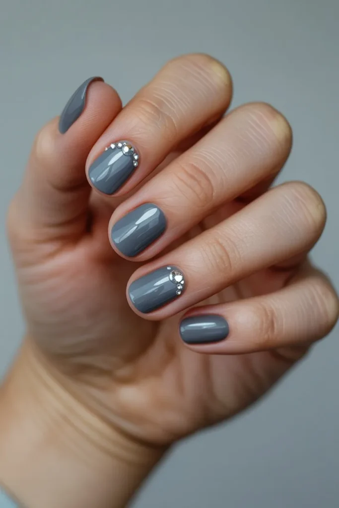 A few rhinestones can elevate short gray nails instantly. Place a single rhinestone near the cuticle or create a small pattern on one accent nail. It’s subtle but adds just enough sparkle to keep things interesting.