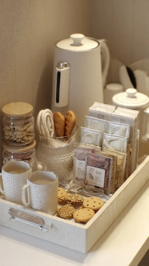 A small refreshment station is a wonderful way to pamper guests. Include a tray with a kettle or coffee maker, mugs, tea bags, instant coffee, sugar, and creamers. Add a few snacks like biscuits, granola bars, or chocolates.