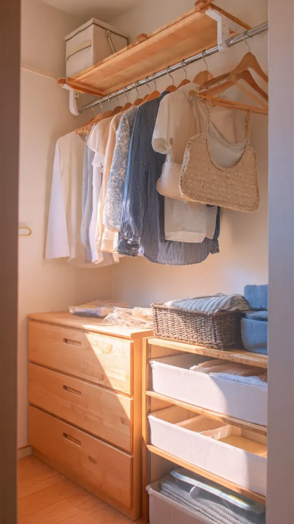 Guests need somewhere to put their belongings, even for short stays. Clear out a few drawers in a dresser or add a small wardrobe or hanging rack. Provide a few empty hangers and leave some open shelf space for folded clothes or bags.