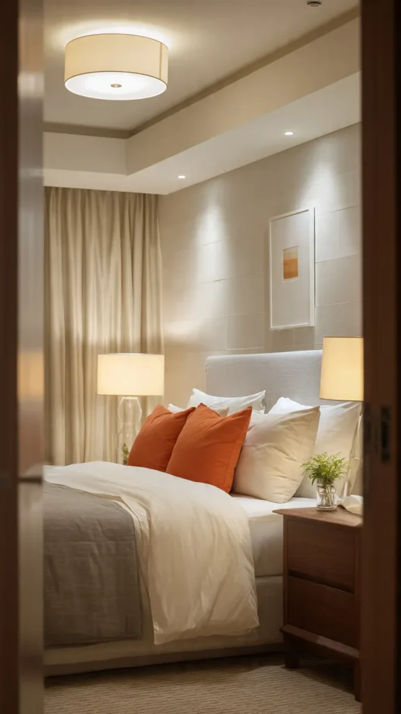 Lighting sets the mood of the room. Combine ambient lighting with softer task lighting to create a warm and cozy atmosphere. A ceiling light provides general brightness, while bedside lamps allow guests to read or relax without harsh overhead light.