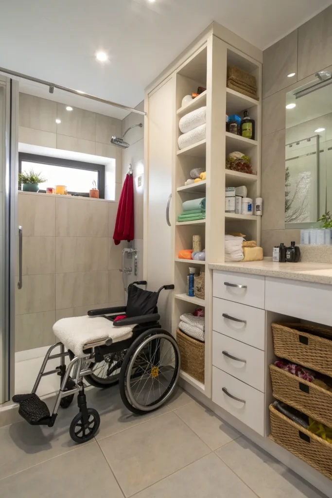 Organization is key to creating a clutter-free, safe bathroom. Install shelves and storage solutions at reachable heights for wheelchair users or individuals with limited reach. Avoid high cabinets and instead use pull-out drawers or open shelving. In the shower, ensure niches or caddies are low enough for easy access. Soft-close drawers reduce noise and prevent accidental slams.