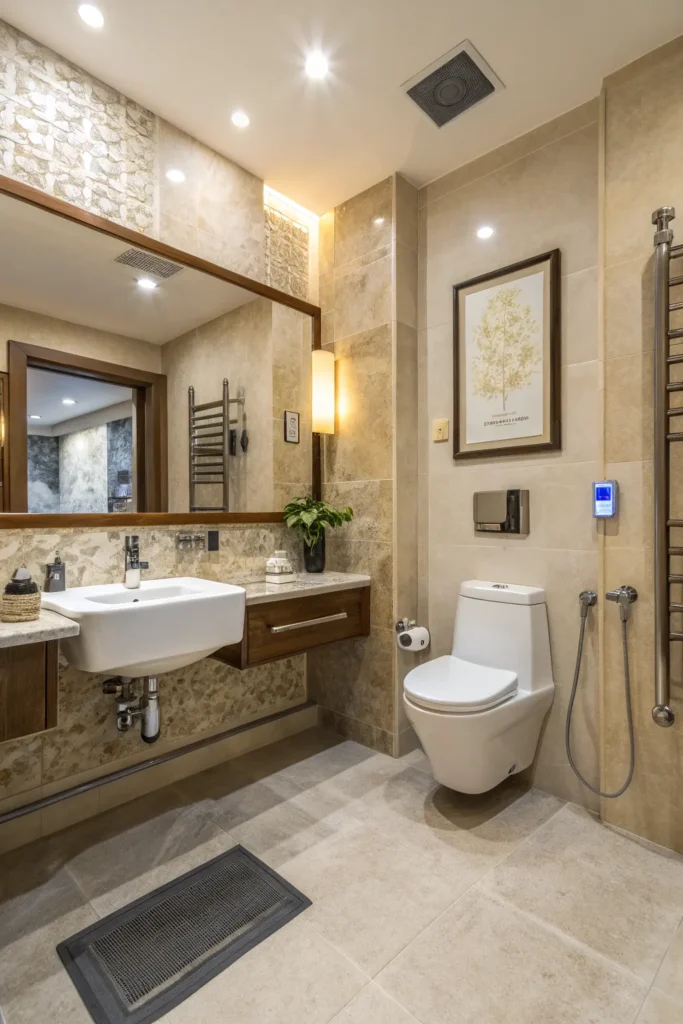 Modern smart features can dramatically improve independence. Motion-activated faucets, automatic toilet flushers, heated floors, and voice-controlled lighting all create a more convenient environment. Smart mirrors with built-in lighting and fog control offer better visibility. Even simple upgrades like a digital thermostat for precise water temperature can help support comfort and safety.