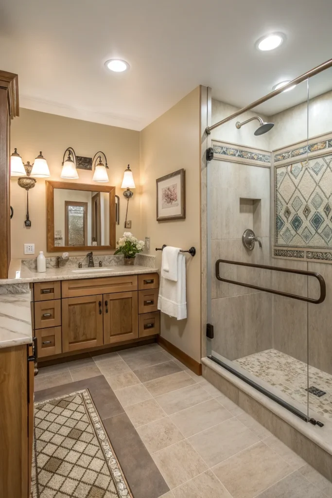 Slips are one of the most common bathroom accidents, especially in wet environments. Opt for slip-resistant flooring materials like textured tile, rubber flooring, or vinyl with a high slip rating. Matte-finish porcelain tiles offer excellent traction while maintaining a high-end look. Avoid glossy tiles that become slippery when wet. Extending the non-slip flooring into the shower creates a seamless and safe surface.
