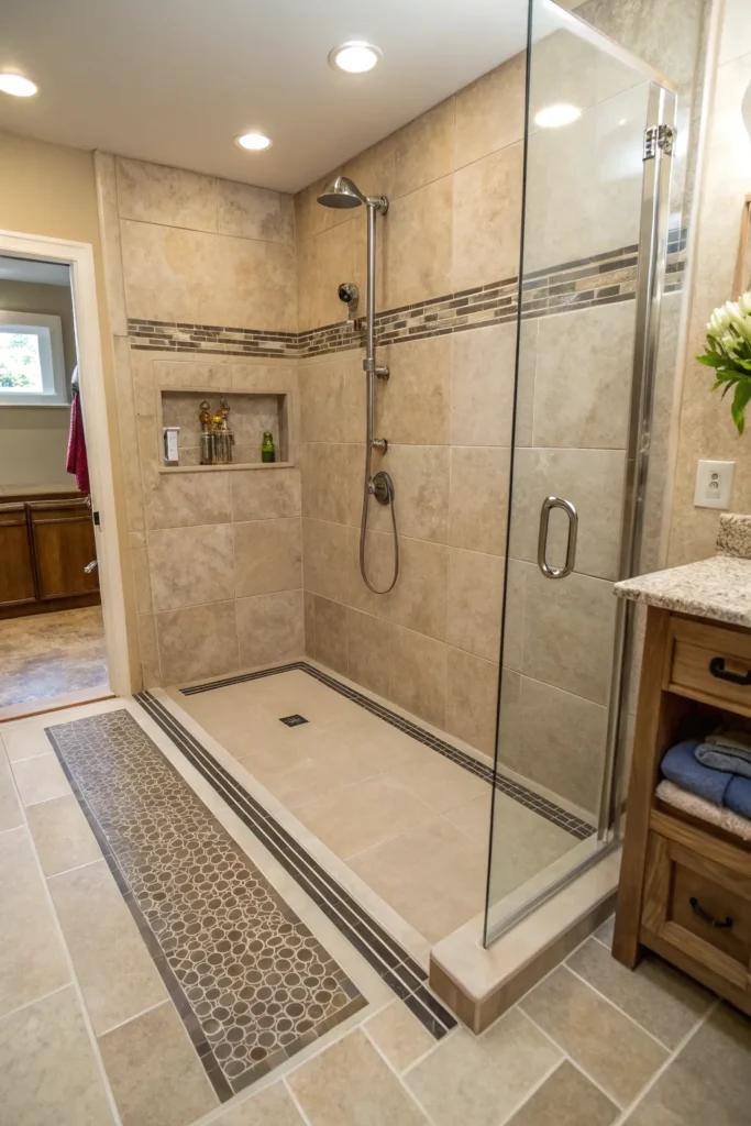 A curbless shower makes entering and exiting significantly easier for wheelchair users and those with limited mobility. No-threshold showers eliminate tripping hazards and allow seamless wheelchair access. Pair the shower with a wide entrance—ideally at least 36 inches—to provide plenty of room. Adding a linear drain ensures proper water flow without the need for a raised lip.