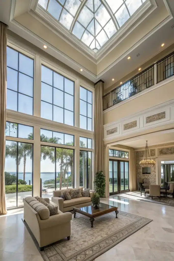 High ceilings pair beautifully with oversized windows, allowing natural light to flood the space. If your living room already has tall windows, enhance them with beautiful window treatments. If you’re renovating, consider adding expansive glass sliding doors or stacked windows. Natural light softens the room’s height and makes the space feel airy and connected to the outdoors.