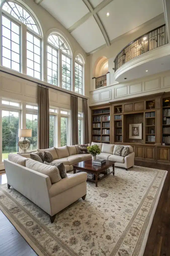 A high-ceiling living room can feel too open if everything is spaced out. Instead, create cozy zones within the room. Use area rugs to define seating spaces, add floor lamps for intimate lighting, and place furniture strategically to form conversation areas. Breaking the room into zones adds warmth and makes the height feel intentional rather than overwhelming.