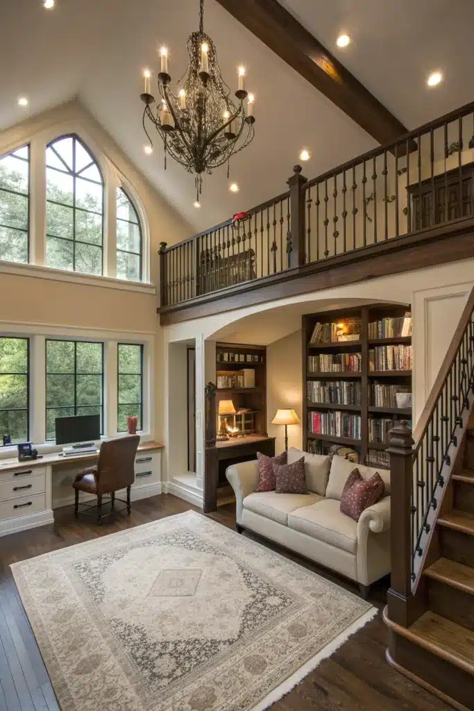 If your high ceiling is exceptionally tall, you can add a loft or mezzanine space. This adds functionality and charm while making better use of the height. You can turn it into a reading nook, office space, or even a small library. Loft spaces help break up the vertical height and add a cozy dimension to large living rooms.