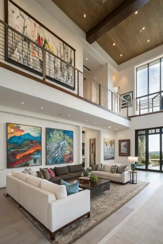 Large-scale art pieces are perfect for high-ceiling living rooms because they fill space without making the room feel cluttered. Oversized abstract paintings, canvas prints, or vertical wall art works wonders to bring proportion. A gallery wall that climbs upward is also a great way to highlight the height while showcasing your personality.