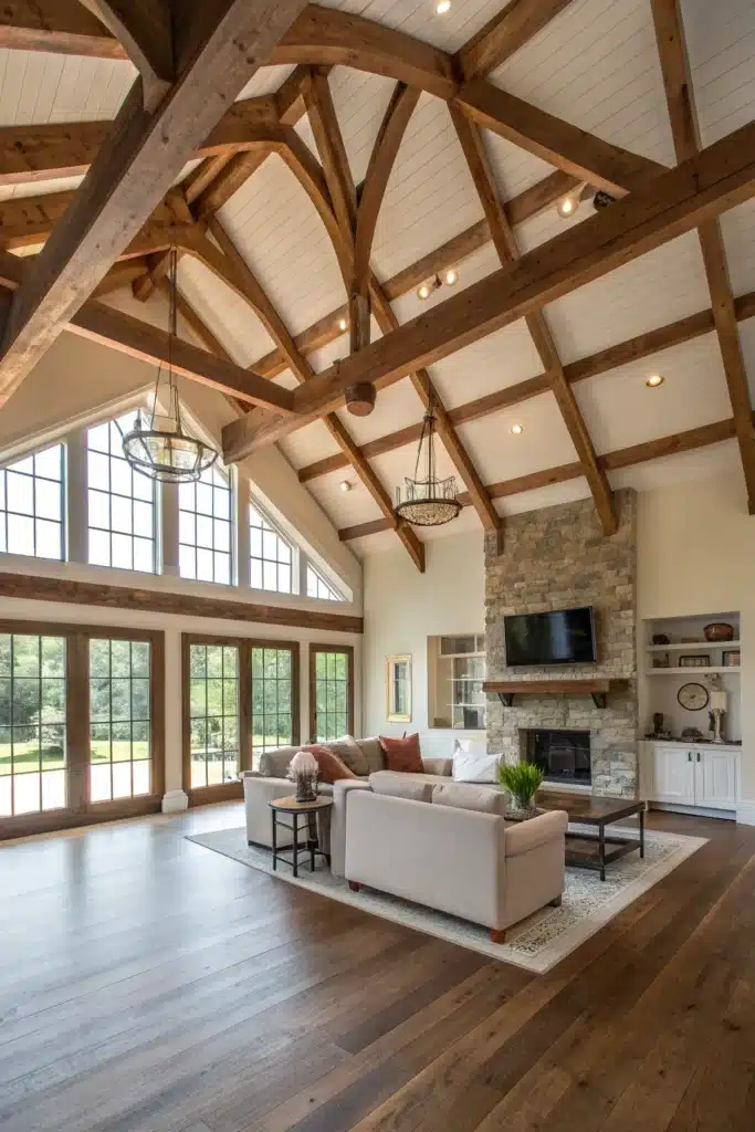 Exposed wooden beams can make a vast room feel grounded, welcoming, and visually appealing. Whether raw, polished, or painted, beams add architectural interest and draw attention to the ceiling. They look especially beautiful in farmhouse, rustic, or industrial-style interiors. If your home doesn’t have beams structurally, faux beams are an easy alternative.
