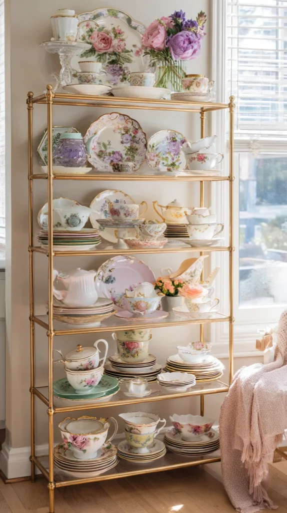 Showcase beautiful vintage china, teacups, or serving pieces creating nostalgic displays that honor tradition and add feminine elegance to spaces. Arrange pieces on open shelving, in glass-front cabinets, or on sideboards using plate stands and varied heights for visual interest. Include pieces with sentimental value like inherited china or collections she’s assembled over years celebrating her taste and history.