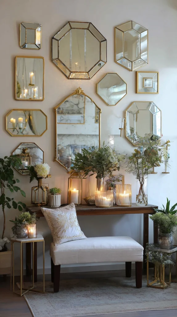 Enhance natural light through strategically placed mirrors that reflect windows and bright areas making spaces feel larger and more luminous. Position mirrors opposite windows to maximize natural light reflection, or create gallery walls of various-sized mirrors adding architectural interest. Combine with candles, fairy lights, or table lamps positioned to reflect in the mirrors multiplying light sources throughout rooms.