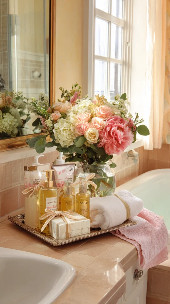 Transform the bathroom into a spa retreat through fluffy towels, aromatic products, fresh flowers, and organized displays creating relaxation-focused environments. Roll white towels and display them in baskets or open shelving, add a tray with luxury bath products, and include a small vase of fresh flowers. Light scented candles, add a plush bath mat, and perhaps include a new robe hanging on a decorative hook.