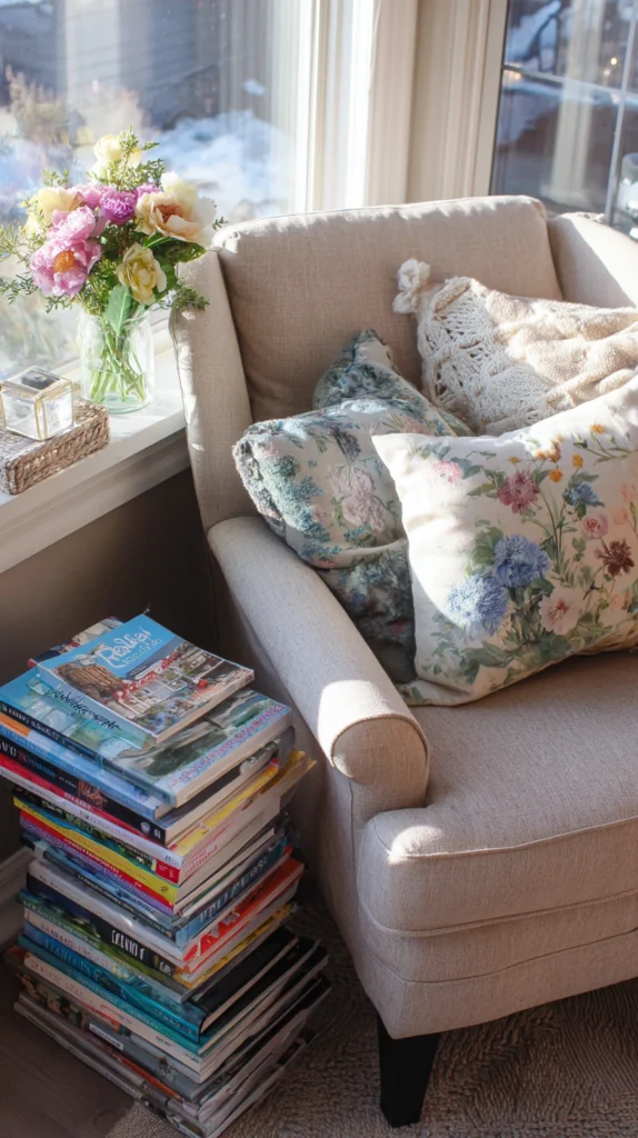 Create inviting reading nooks through stacked books, current magazines, and comfortable seating arrangements encouraging relaxation and leisure. Arrange books by color for visual impact, stack larger books as bases for decorative objects, and display beautiful covers facing outward as art. Add reading lamps with adjustable light, small side tables for beverages, and comfortable cushions making reading spots irresistible.