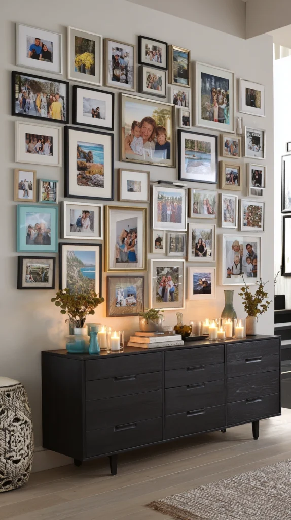 Arrange treasured family photographs in beautiful frames creating a dedicated display honoring mom and celebrating cherished memories throughout the years. Mix frame sizes and orientations creating dynamic gallery walls, or line matching frames along mantels and sideboards for streamlined sophistication. Include photos spanning different life stages from her childhood, wedding, early motherhood, and recent family moments telling her life story through images.