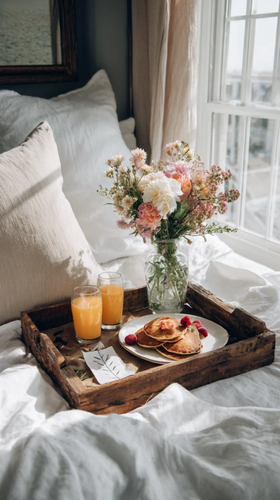 Prepare a beautiful breakfast tray with attention to every detail from fresh flowers in a small vase to pretty linens and attractively plated food. Use a decorative serving tray with legs or a DIY tray adorned with fresh flowers, include a handwritten card, and arrange food artfully on coordinating dishes. Add special touches like cloth napkins, real silverware rather than plastic, and perhaps a small gift positioned on the tray.