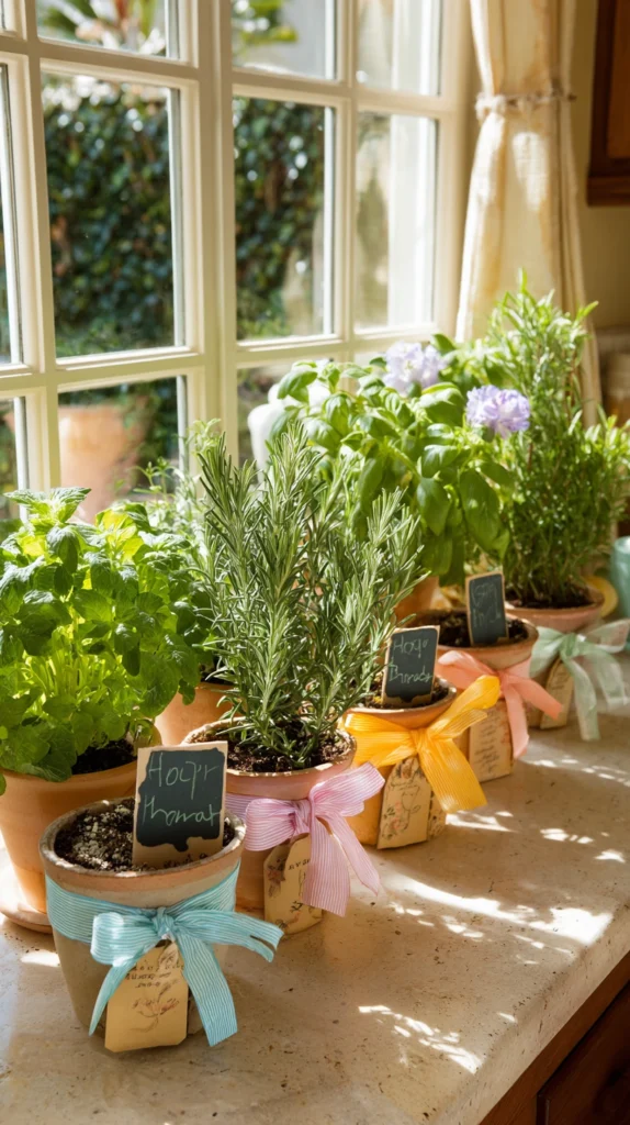Bring life to the kitchen with potted fresh herbs arranged in pretty containers creating both decorative and functional displays mom will appreciate long after Mother’s Day. Choose herbs like basil, rosemary, thyme, and mint in terracotta pots, decorative ceramics, or vintage tins arranged on window sills or countertops. Add small chalkboard labels identifying each herb creating a charming kitchen garden that’s both beautiful and useful.