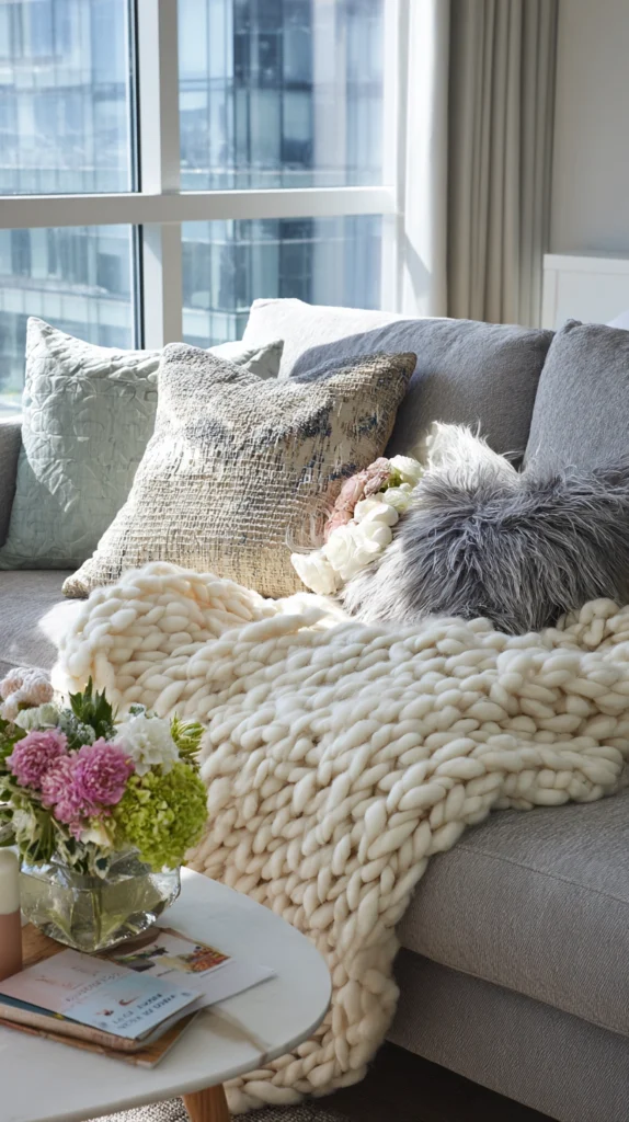 Add luxury and comfort through beautiful throw blankets draped over sofas, chairs, and beds in soft fabrics like cashmere, chenille, or chunky knits. Choose blankets in colors and textures that complement existing décor while adding layers of visual and tactile interest throughout the home. Fold blankets neatly or arrange them in casual drapes that look inviting and encourage curling up for comfortable relaxation.