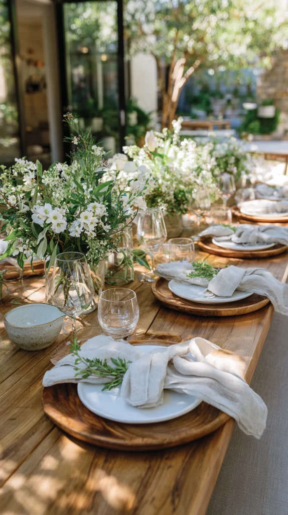 Design a beautiful tablescape using natural elements like fresh flowers, greenery, wooden chargers, and linen napkins creating garden party elegance. Layer each place setting with charger plates, dinner plates, salad plates, and pretty napkins folded creatively or held with decorative rings. Add individual flower stems or small posies at each place setting serving as both decoration and party favors guests can take home.