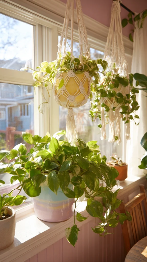 Bring the outdoors inside through hanging plants positioned near windows creating living decorations that add freshness and natural beauty throughout the home. Choose trailing plants like pothos, string of pearls, or spider plants in attractive hanging planters made from macramé, ceramic, or woven materials. Position plants where they’ll receive appropriate light while creating visual interest at varying heights throughout rooms.