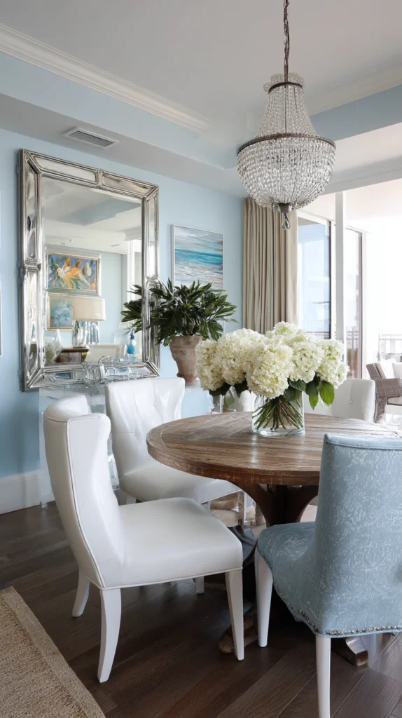 A mirrored wall in a small dining room doubles the visual presence of the table setting, the candlelight, and the gathered company, creating a dinner atmosphere of considerable theatrical richness. The mirror should be chosen for the quality of its frame as much as the quality of its glass — a beautiful mirror frame contributes to the room’s decorative scheme independently of its reflective function.