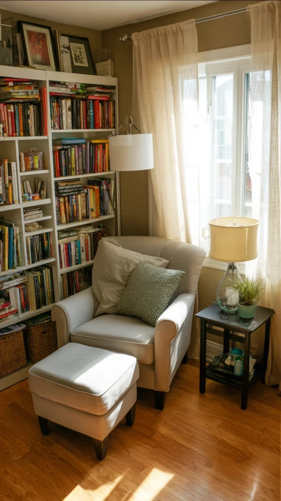 The enclosure can be as simple as the positioning of the chair in a corner with its back to the room, a bookcase flanking one side, and a floor lamp creating a cone of warm light that defines the zone.