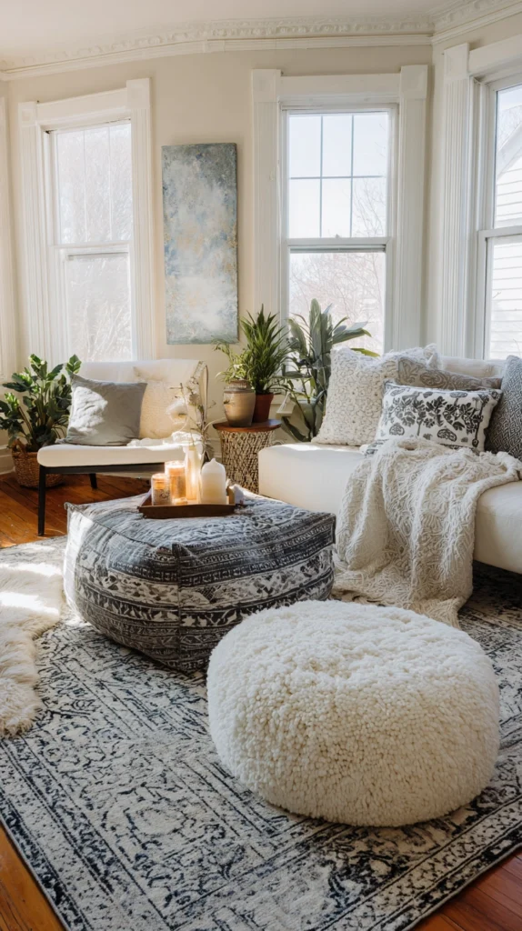 The overhead light — the single ceiling fixture that illuminates the room with even, undifferentiated brightness from above — is the lighting condition least suited to the creation of a cozy, intimate atmosphere, and the first step toward a genuinely comfortable room is the addition of multiple lower light sources that create the pools of warm illumination that the cozy interior requires. Table lamps on side tables beside the sofa, creating warm circles of light around the primary seating positions.